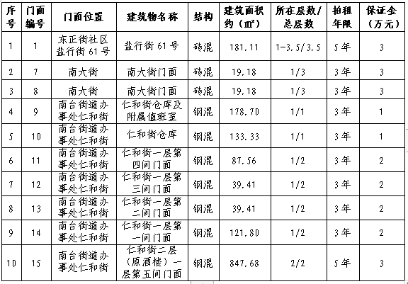 拍租10個國有門面使用權(quán),詳見下表: