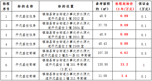 (五)拍租鎮(zhèn)雄縣開(kāi)發(fā)投資有限責(zé)任公司國(guó)有資產(chǎn)3年期使用權(quán),詳見(jiàn)下表: